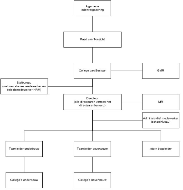 De algemene ledenvergadering is het hoogste orgaan van de stichting. De Raad van Toezicht ziet toe op het bestuur. Het College van Bestuur fungeert als het bevoegd gezag. Voor de dagelijkse gang van zaken wordt de stichting bestuurd door het College van Bestuur in nauw overleg met de voorzitter van de Raad van Toezicht die tevens voorzitter is van de stichting. Het College van Bestuur is voorzitter van het directeurenberaad en onderhoudt een nauw contact met de GMR. Het bestuur stelt het beleid vast.